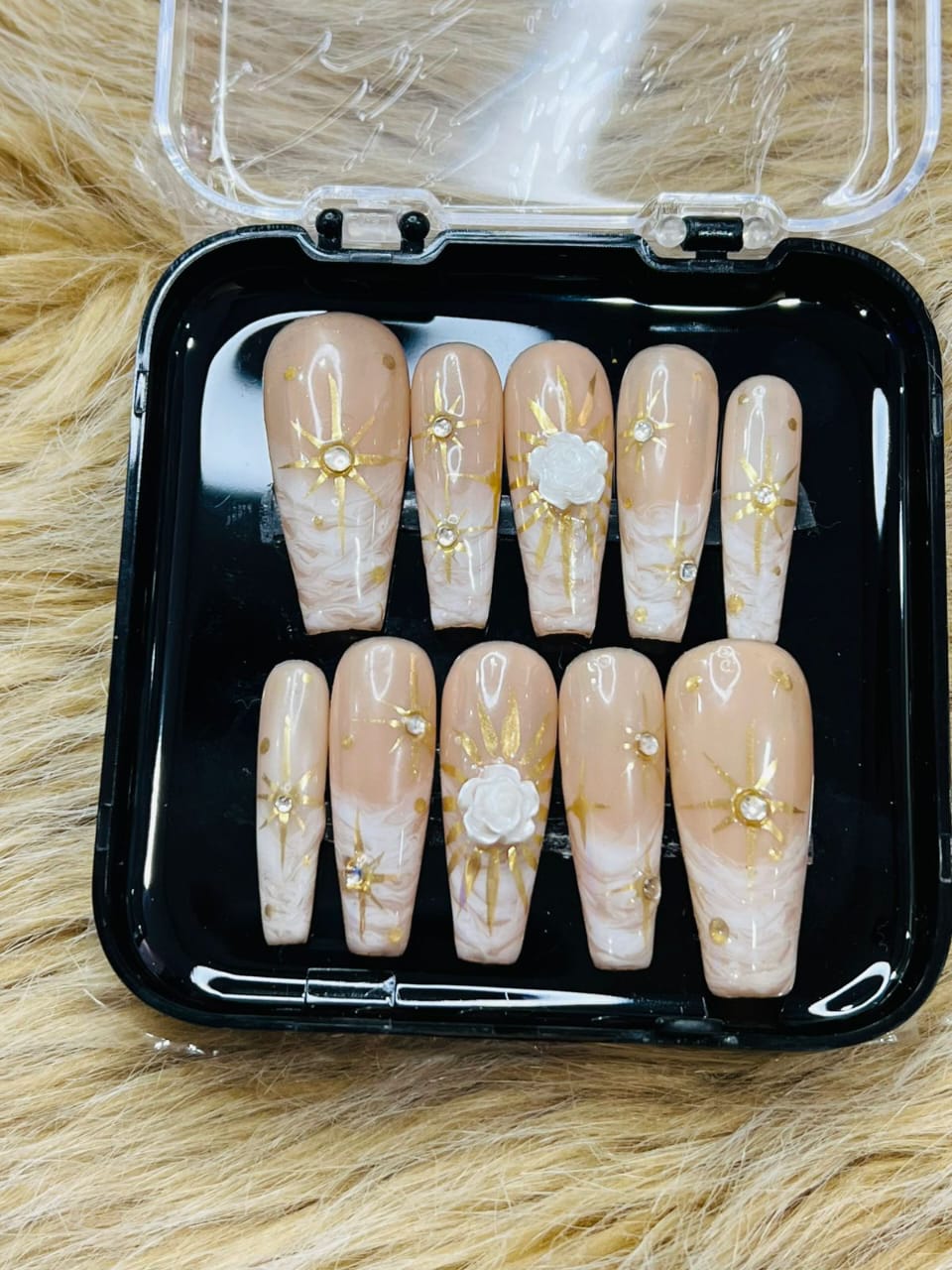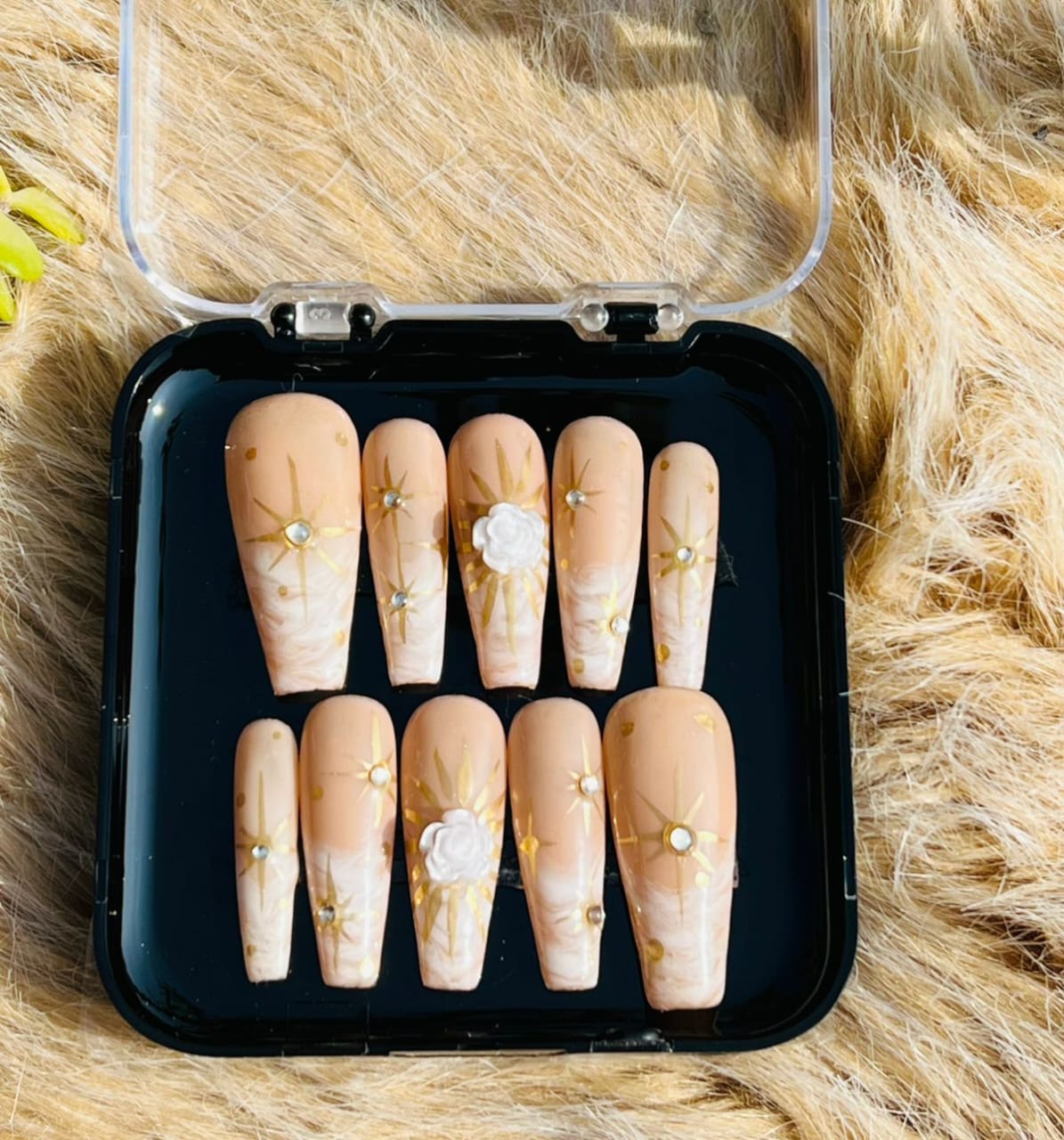 A soft nude nail set elevated with delicate golden sunburst details and pearl accents, creating a graceful blend of elegance and luxury. Perfect for bridal looks, festive occasions, or anyone who loves a subtle yet radiant statement. Designed to give a timeless, glowing finish with a premium handcrafted feel.