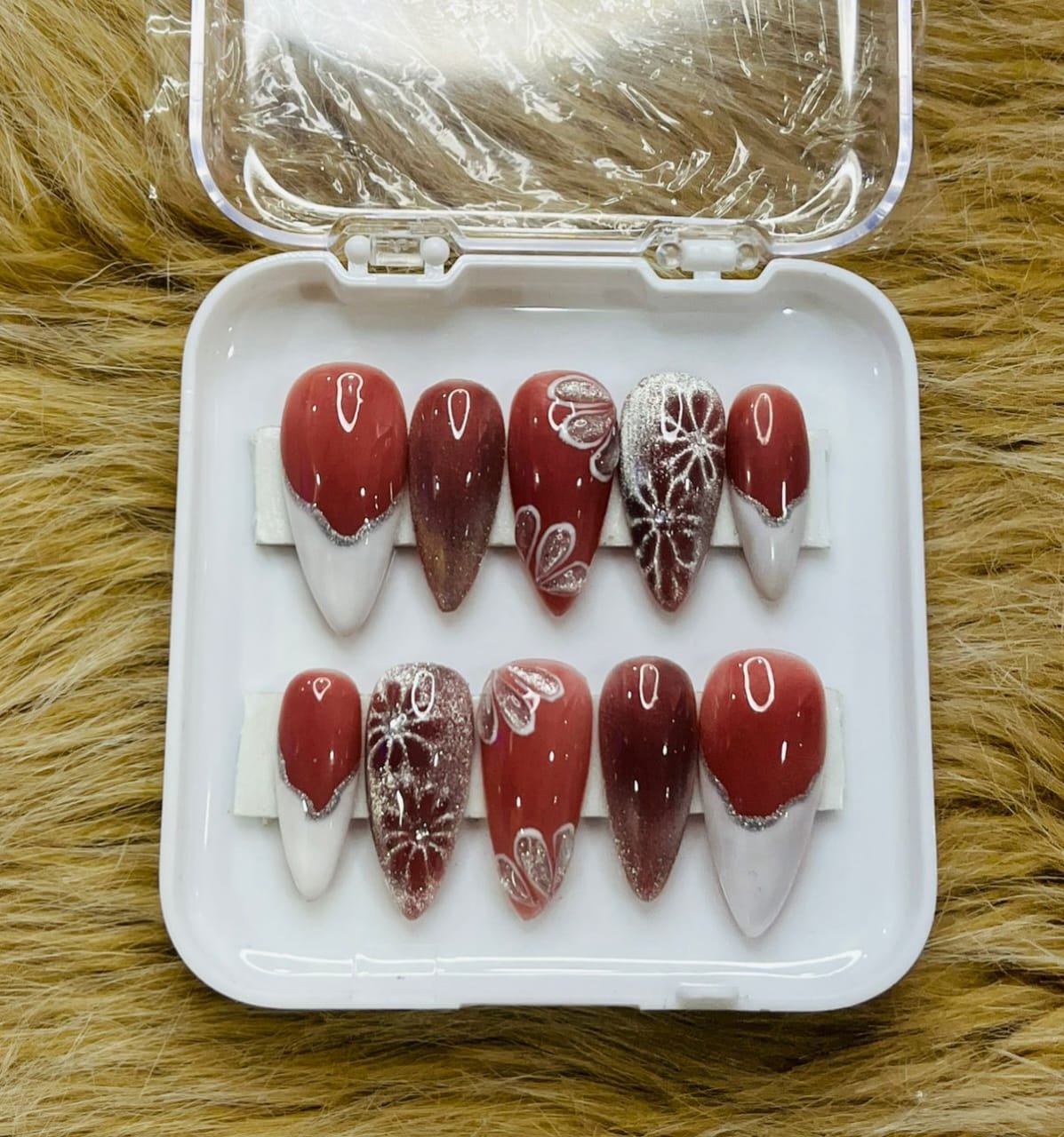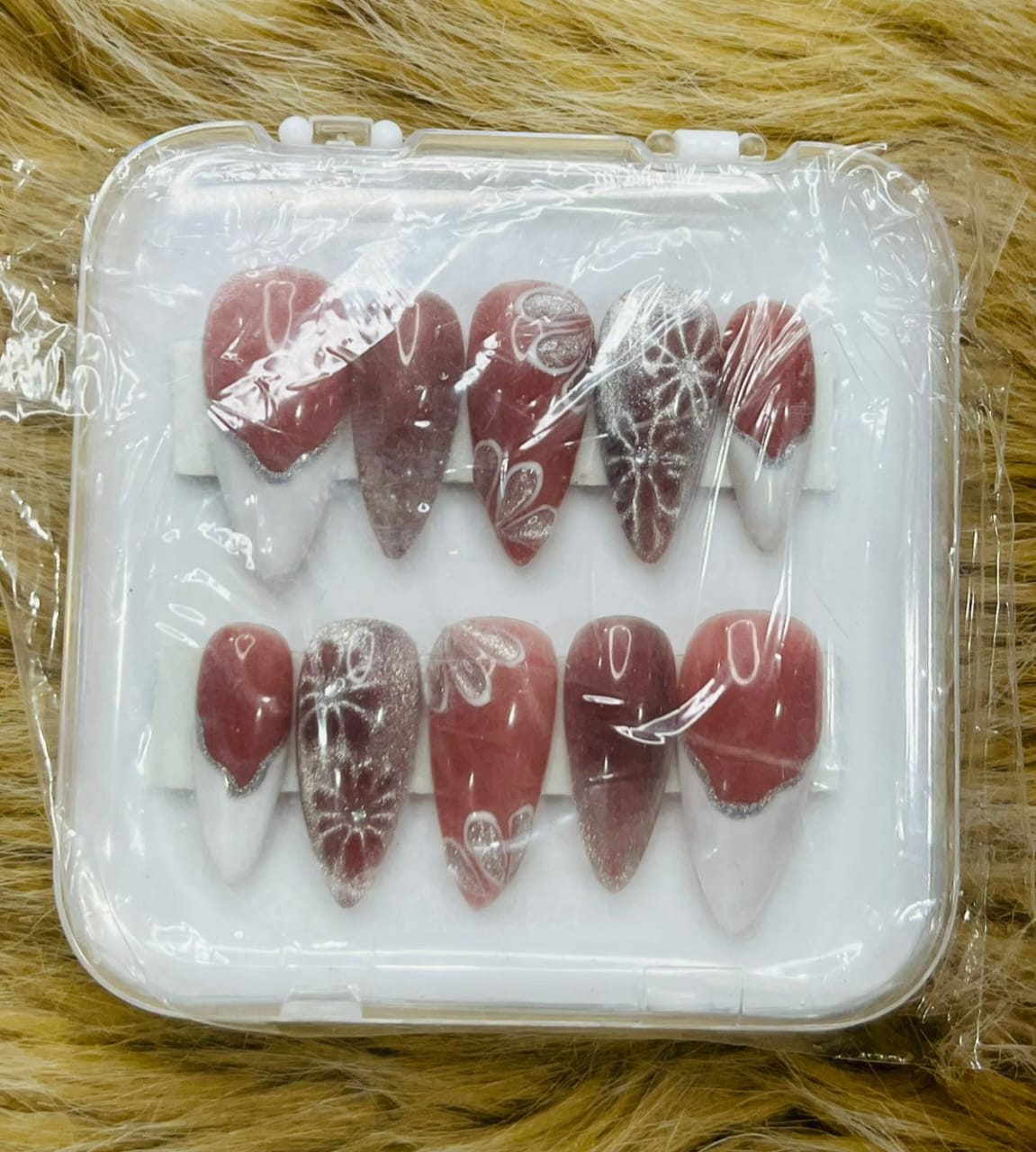 A soft rosy pink nail set enhanced with delicate silver shimmer and subtle floral detailing, creating a perfect balance of elegance and charm. Ideal for festive occasions, parties, or everyday glam, this design offers a timeless, polished finish with a premium handcrafted feel.