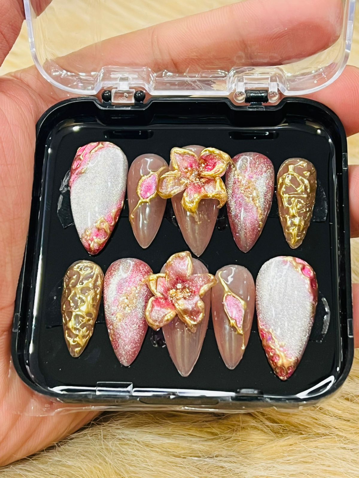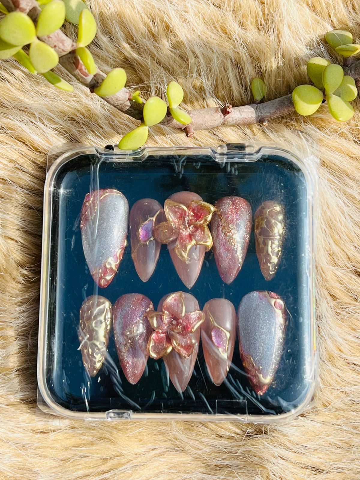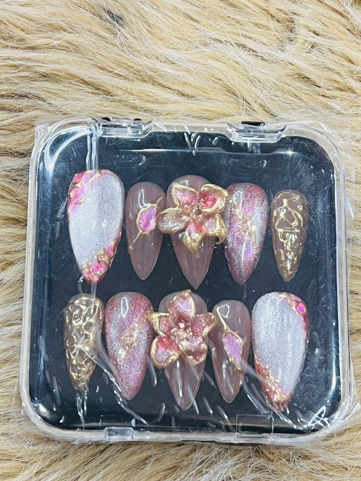 A luxurious rose gold nail set featuring delicate 3D floral accents, soft blush tones, and shimmering highlights. Designed to create a graceful yet glamorous look, this set is perfect for weddings, festive occasions, and statement styling. The premium handcrafted finish adds depth, elegance, and a radiant glow to every look.